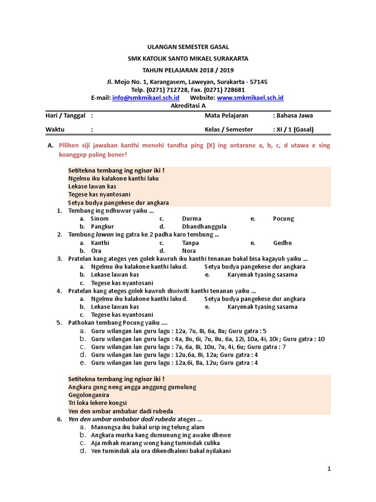 Uas Basa Jawa Sem 1 Kelas Xi 2018 2019